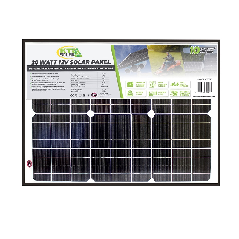Designed for maintenance charging trickle charging 12V lead-acid batteries that power jet ski motorcycles ride-on lawn mowers surveillance camera systems home irrigation systems electric fences electric gates and garden lighting. Requires regulations from solar charge controller. Suited to KT Solar Controller Model No. KT70755 8amp PWM solar charge controller.
